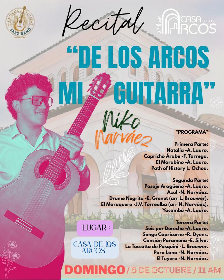 El próximo domingo 5 de octubre a las 11:00 a.m., la Casa de los Arcos será escenario de un recital de guitarra que promete un recorrido lleno de color y emoción. El guitarrista Niko Narváez presentará el concierto titulado “De los Arcos mi Guitarra”, en el que combina clásicos del repertorio guitarrístico con composiciones propias y arreglos de grandes maestros.